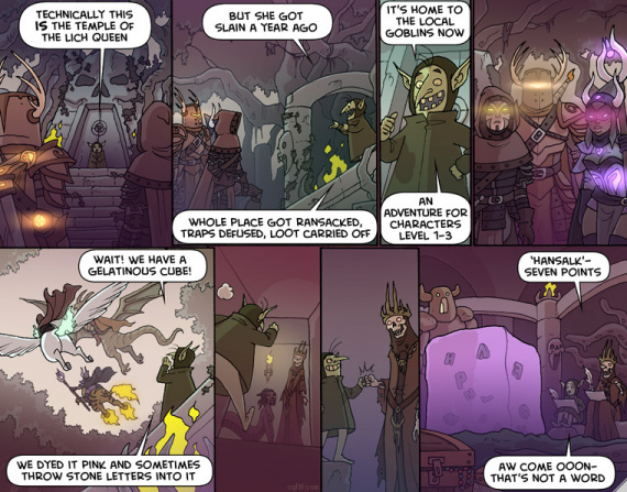 Опять же, в среднем приключении мы если сталкиваемся со следами предыдущих партий (напрямую или хотя бы в виде лута), то этих самых партий единицы, не десятки (если мы не о всяких мегаподземельях на десятки этажей и сотни комнат). Понятно, что не всякий приключенец оставляет след, который продержится годы, но кости неудачников по углам всё-таки один из признаков жанра, да и всякие «монстры-уборщики» редко утилизуют все следы приключенцев полностью (это не говоря уже про тех, которые эти следы наоборот, консервируют — собирают лут конкретного типа или всякая нежить, которая делает из убитых себе подручных, например)